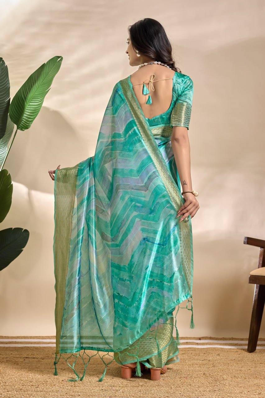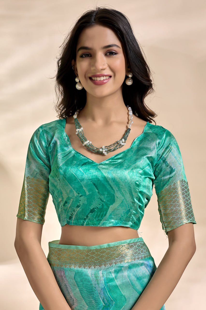 Gracefully crafted in a serene sea green hue, this soft silk blend saree features a flowing wave-inspired pattern that exudes elegance and sophistication. The smooth drape enhances its charm, while the shimmering zari border adds a refined traditional touch.