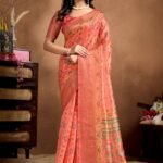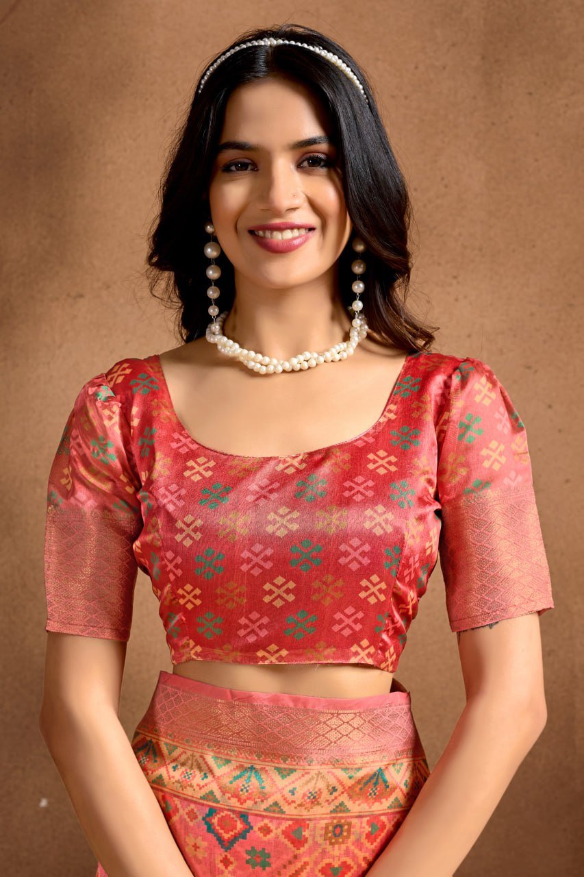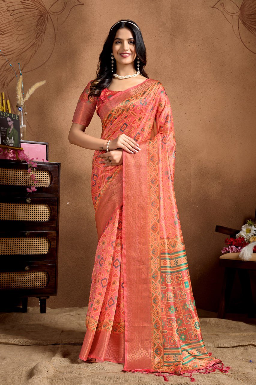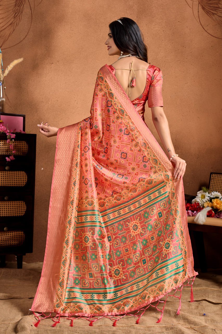 Add a splash of tradition to your wardrobe with this peach-toned soft silk blend saree. Intricately woven with Patola-inspired motifs and enhanced with vibrant multicolor detailing, the saree features a contrasting pallu and a rich zari border, giving it a regal festive appeal.