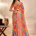 A perfect blend of festive charm and traditional elegance, this soft silk blend saree comes in a warm orange base beautifully adorned with colorful woven mandala-style motifs. The pink zari border and pallu add a graceful touch, making it ideal for special occasions and cultural celebrations.