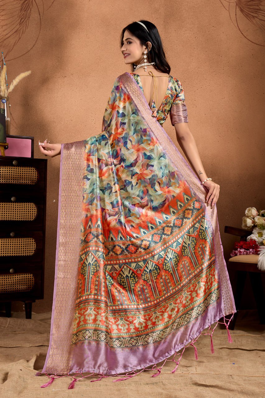 Drape yourself in artistic elegance with this multicolor soft silk saree featuring a mesmerizing abstract floral print that beautifully transitions into a traditional ethnic motif pallu. The intricate patterns in vibrant hues give it a regal charm, while the shimmering zari-woven lavender border adds an exquisite finish.
