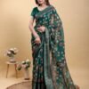 Elevate your traditional wardrobe with this absolutely stunning Teal Green Saree. Crafted from the Jacquard Patta Linen Cotton fabric, this saree features a deep, jewel-toned base that exudes sophistication. The body and pallu are adorned with a beautiful, large-scale digital floral print in soft pinks and oranges, creating a breathtaking contrast.