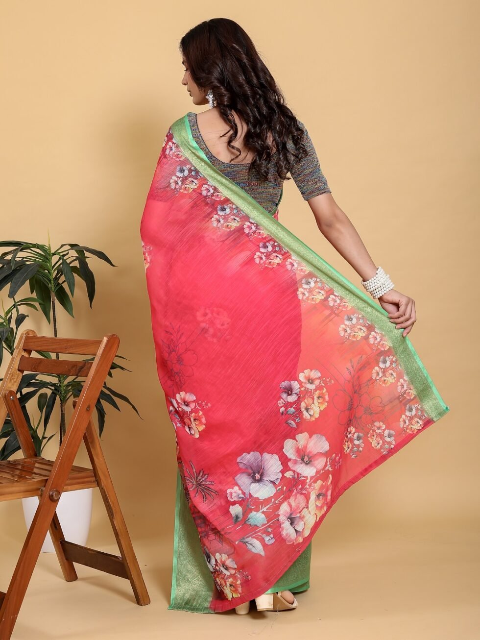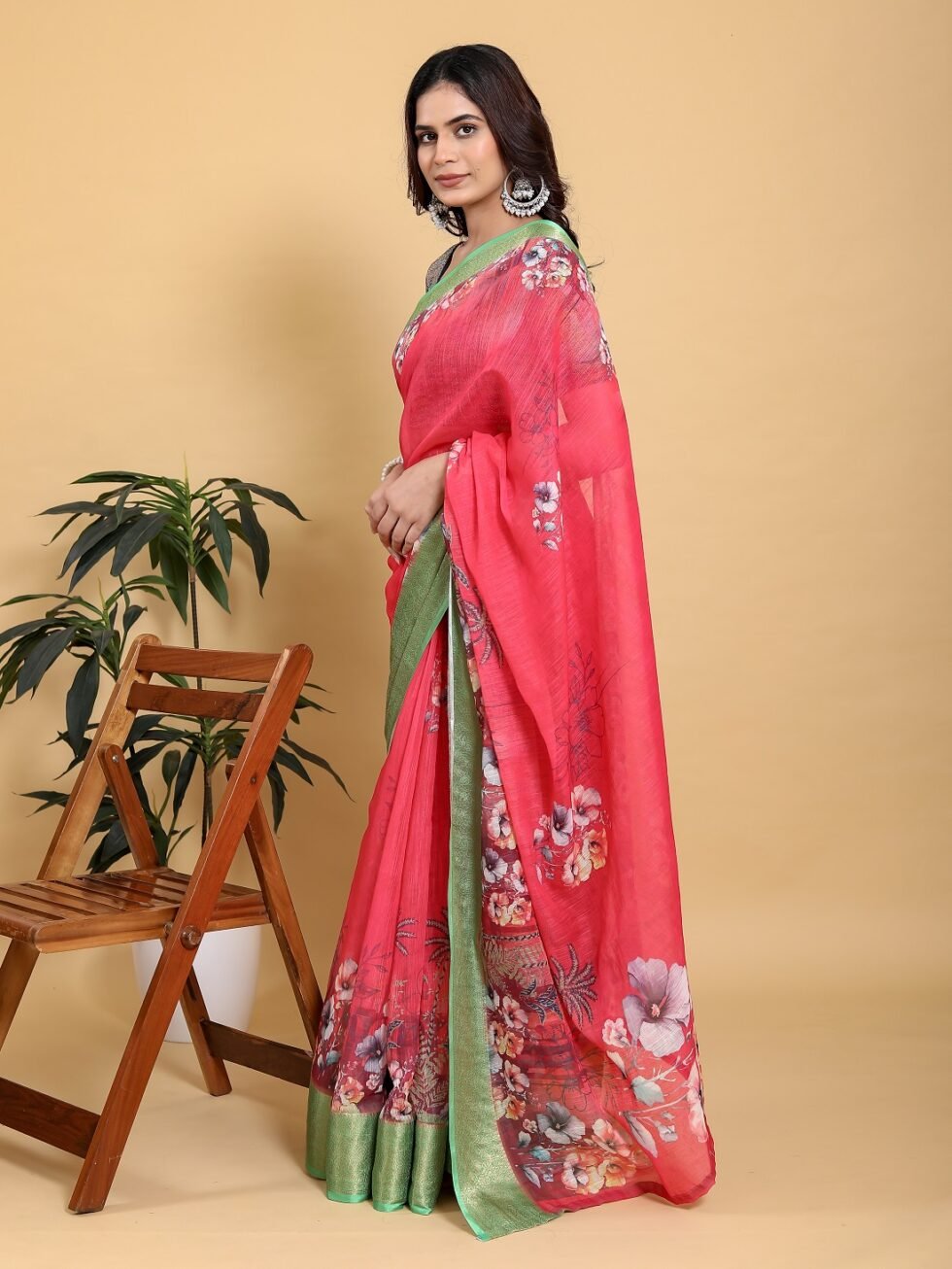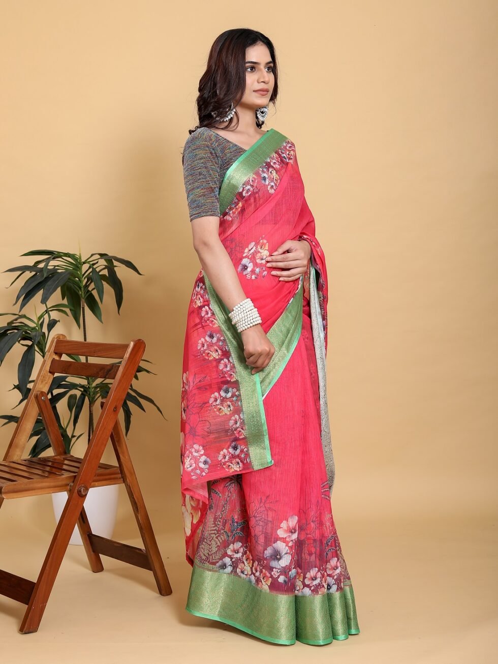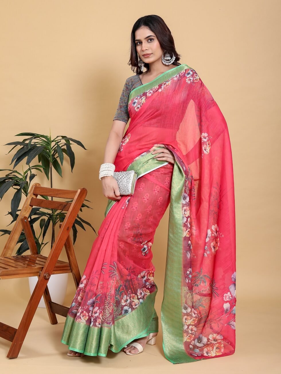 Make a dazzling entry in this vibrant Rani Pink Saree, a stunning combination of bright colour and delicate design. Crafted from the comfortable Jacquard Patta Linen Cotton fabric, the saree has a beautiful drape. The bold pink base is brought to life by an elegant large-scale digital floral print on the pallu and lower body.