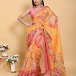 This luminous saree is crafted from a soft, breathable Jacquard Patta Linen Cotton blend, featuring an enchanting all-over digital floral print. The rich sunshine yellow ??? is beautifully contrasted with a wide, striking rani pink jacquard border. The lightweight fabric is comfortable for all-day wear and perfect for festive or daytime events.