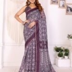 A graceful wine-purple saree crafted in soft Chanderi fabric, featuring intricate traditional motifs across the body. The rich contrast of detailed prints and artistic pallu enhances its ethnic charm, making it a timeless choice for festive occasions and cultural events.