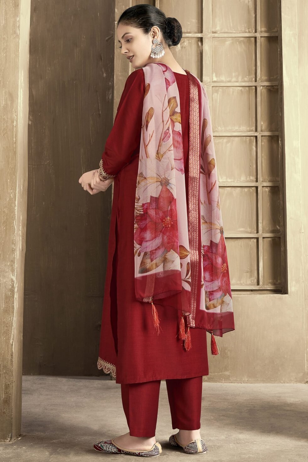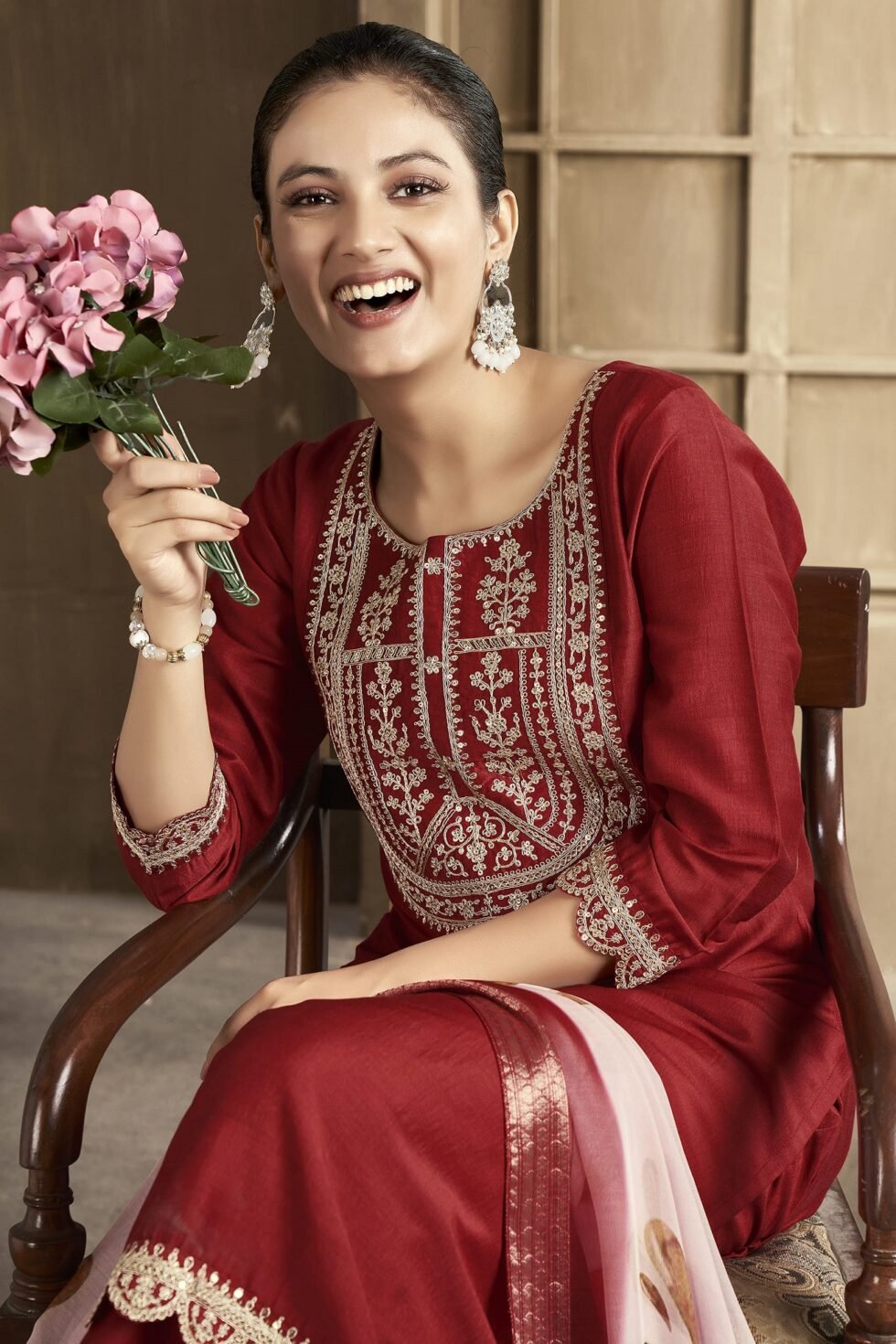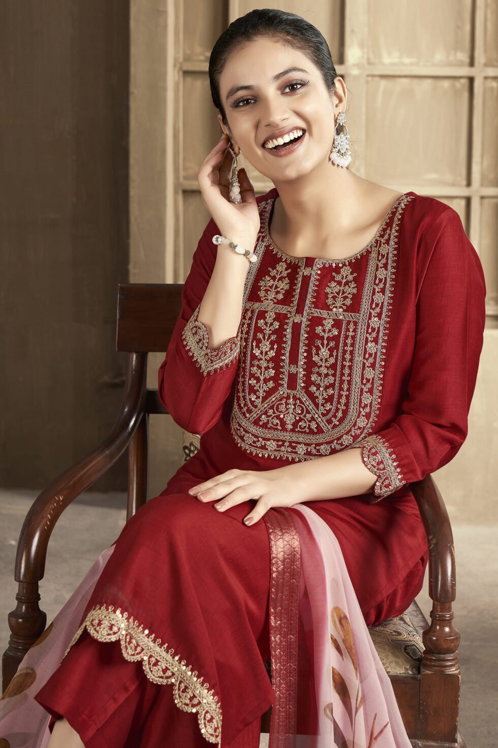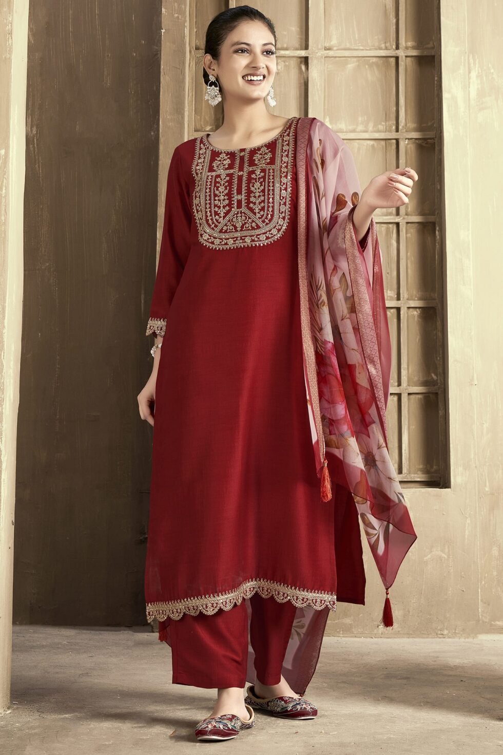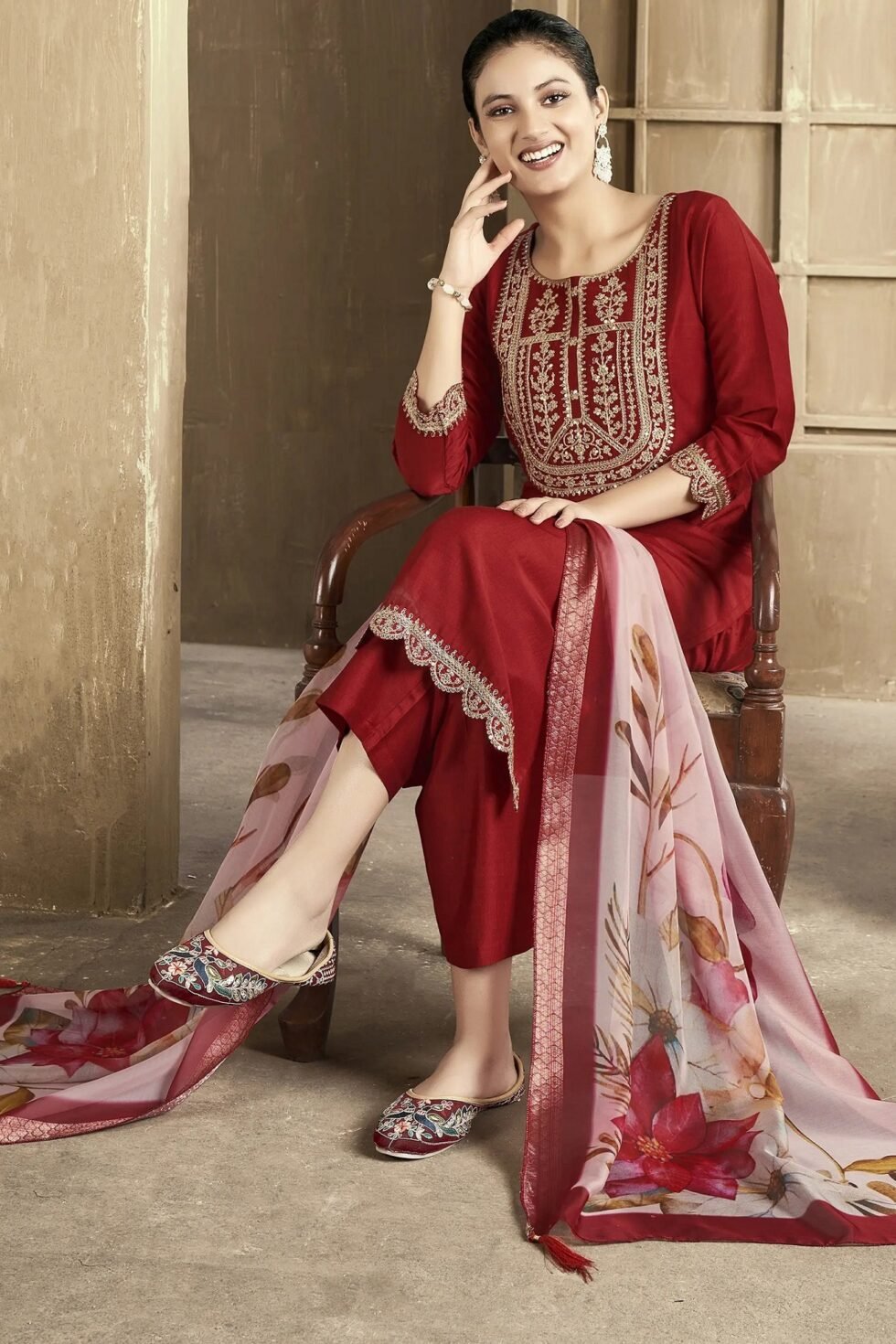 Women’s Chanderi Embroidered Straight Kurta Pant With Dupatta