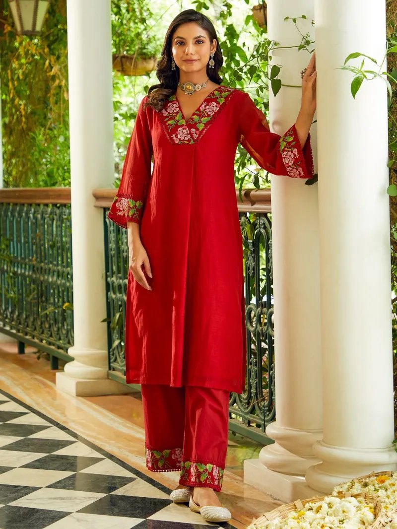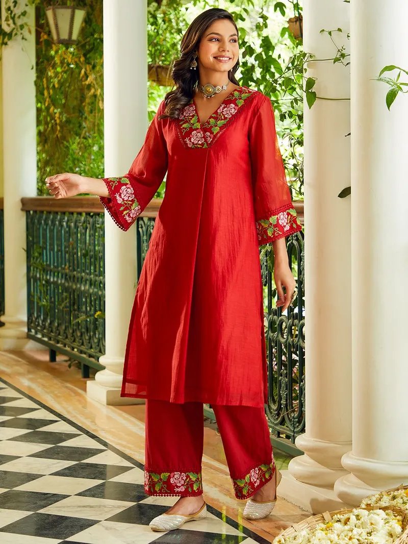 Women’s Chanderi Embroidery Straight Kurta Pant With Dupatta