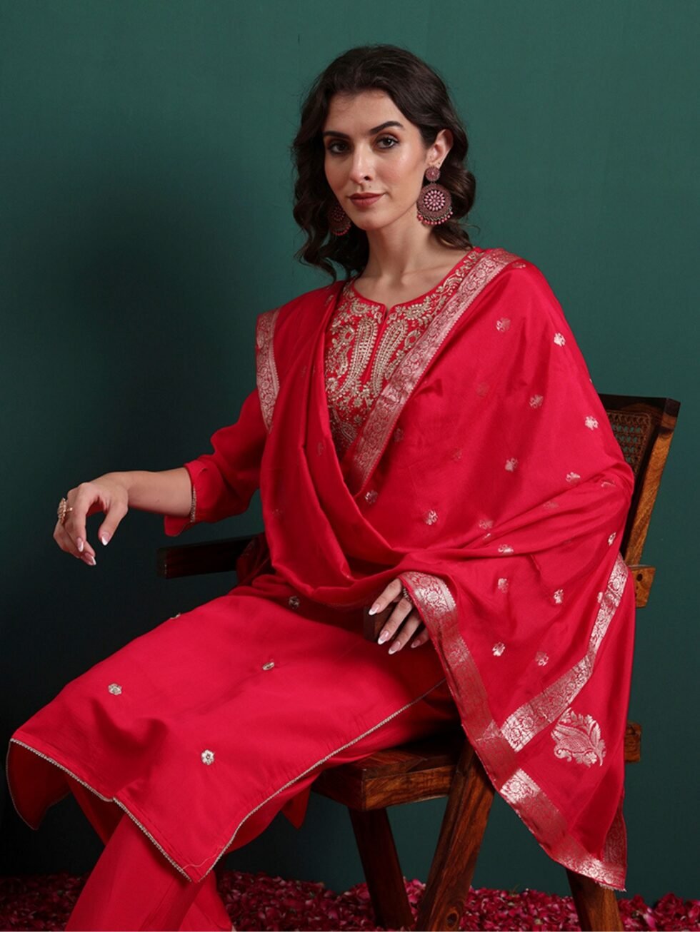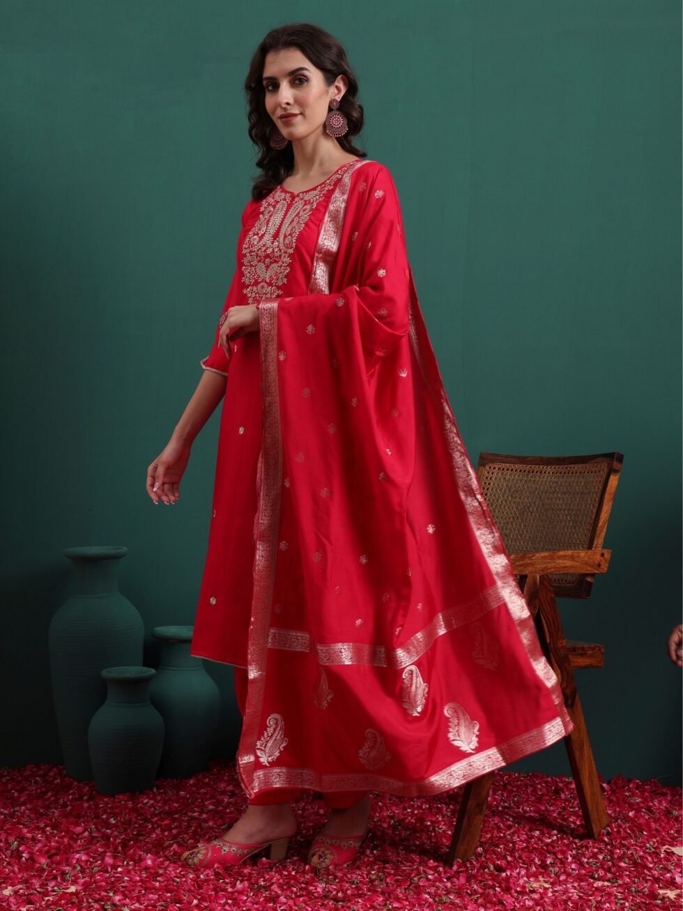Women’s Chanderi Silk Embroidery Straight Kurta Pant With Dupatta