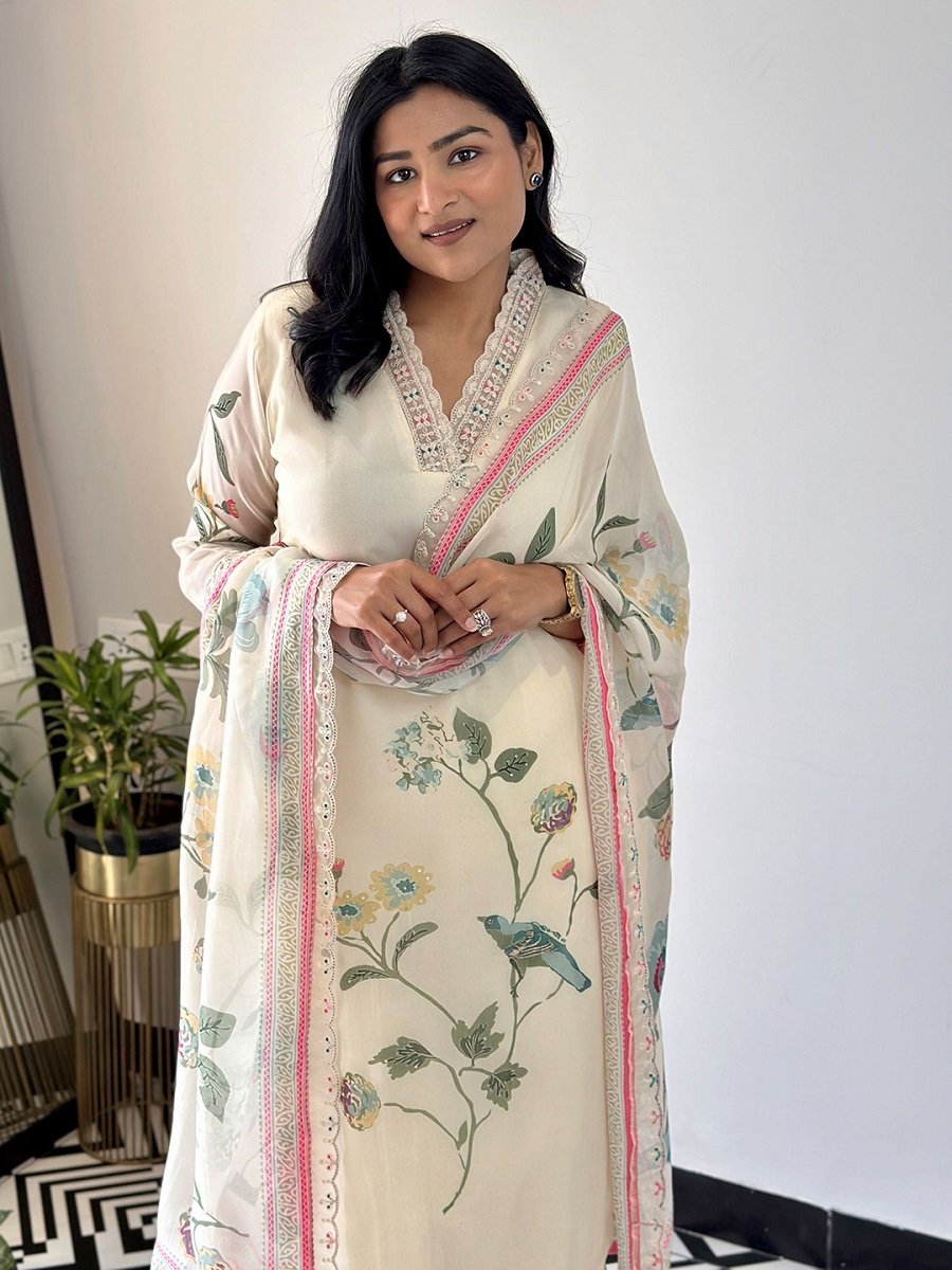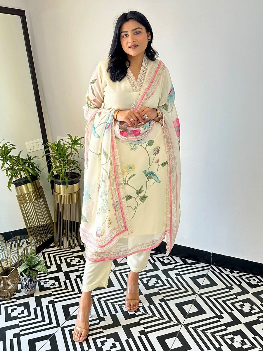 Designer Kurta set is available in Chanderi material with Floral Soft Organza dupatta. This kurta set has an Printed work. Perfect for wedding, party, festive wear outfit