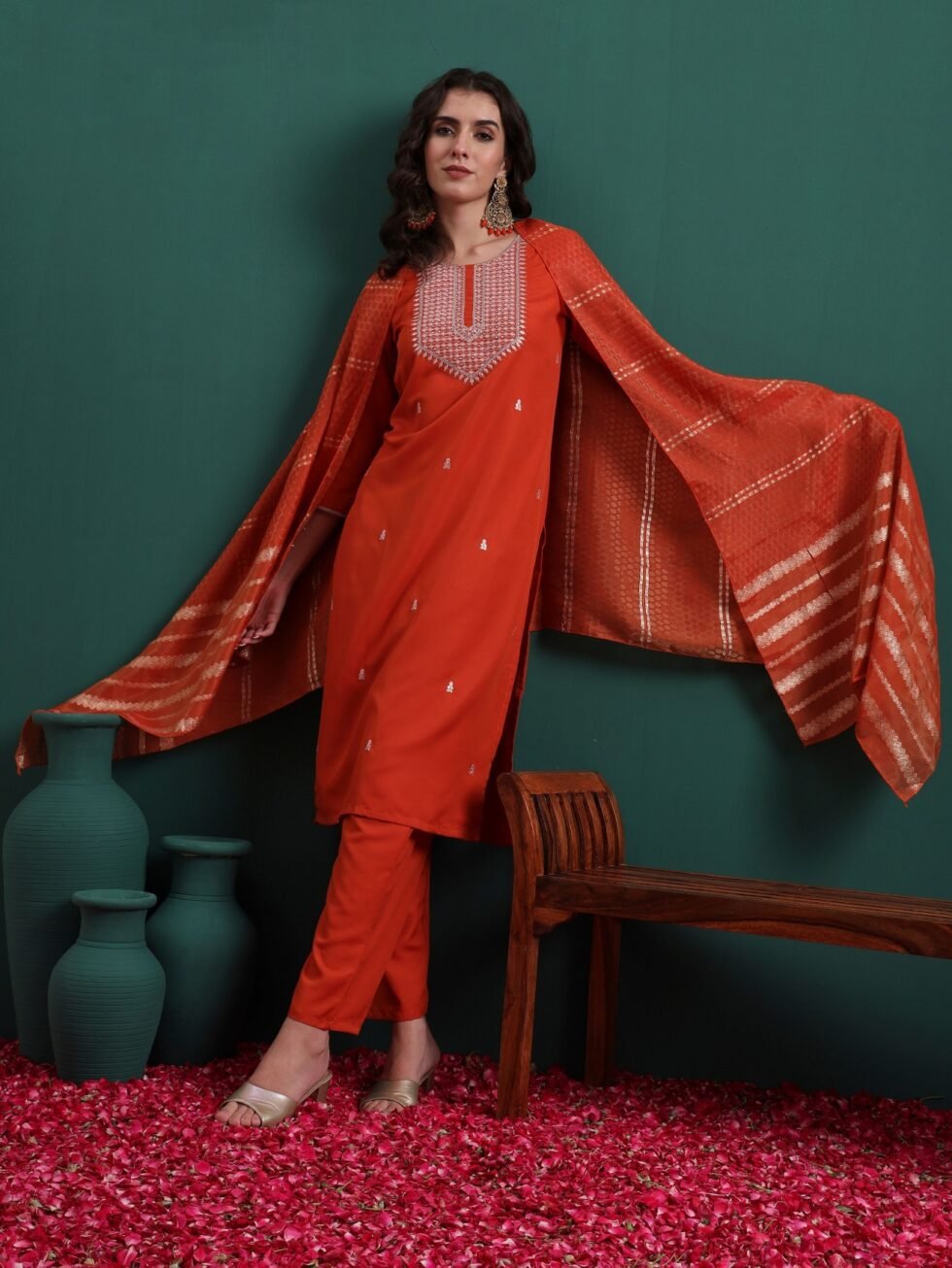 Designer Orange Kurta set is available in viscose material with woven dupatta. This kurta set has an embroidery work. Perfect for wedding, party, festive wear outfit